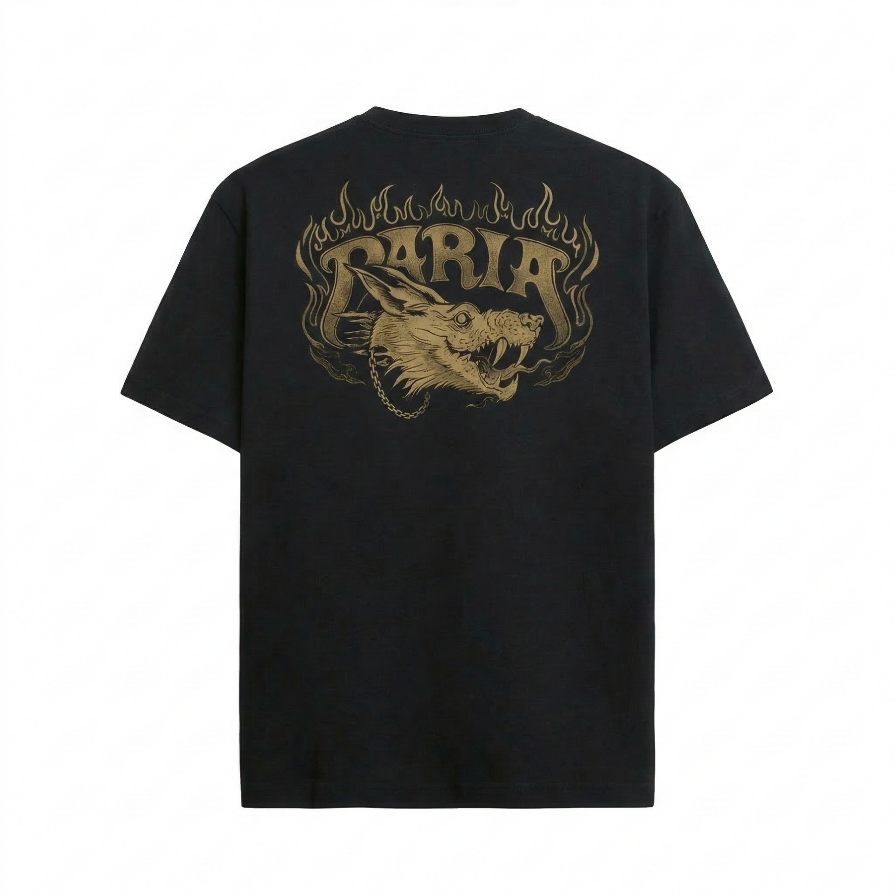 The front features a minimal PARIA flame-logo on the left chest, while the back makes a statement with a high-detail, snarling wolf graphic framed by an ornate flame border and finished in a vintage distressed gold ink.