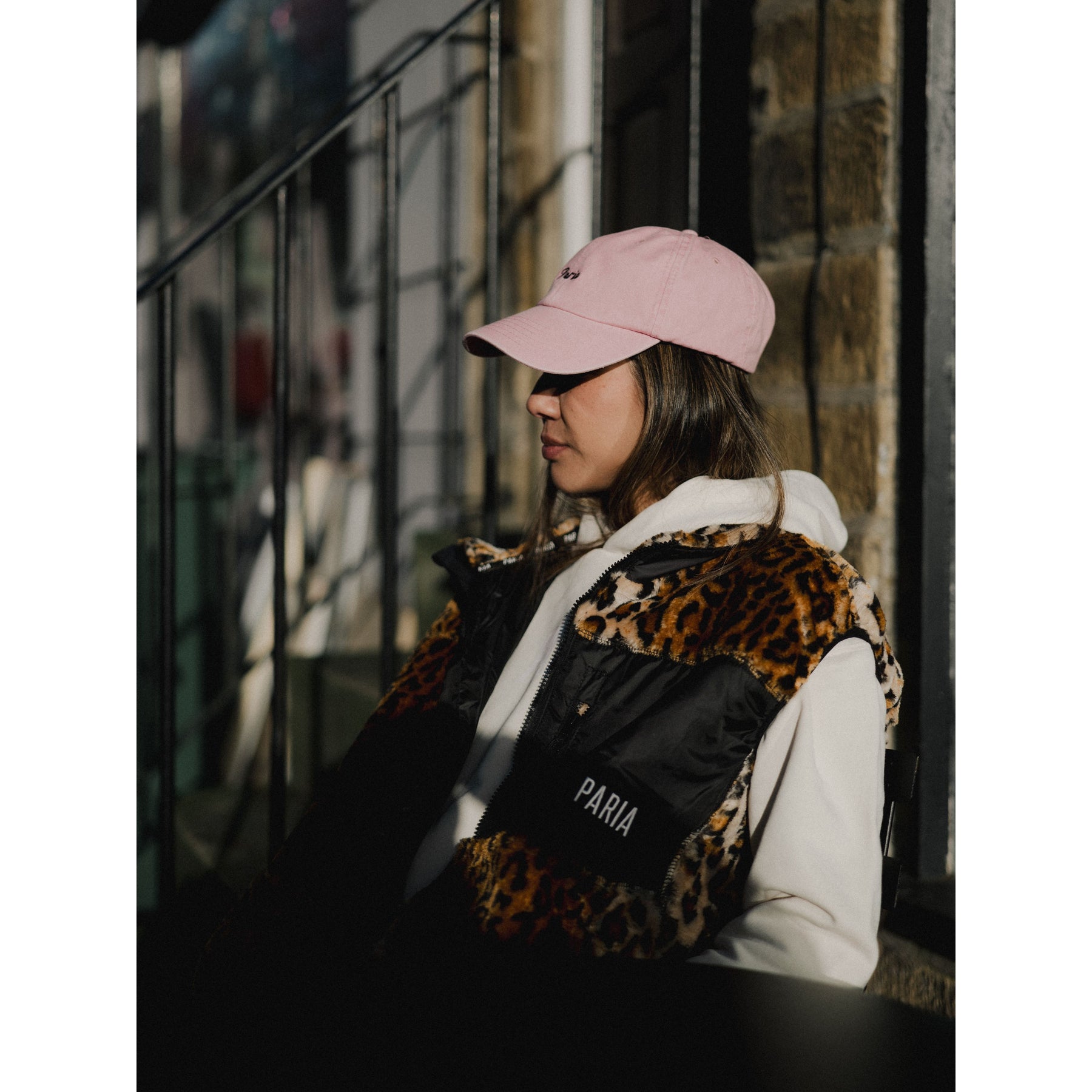 Person wearing a leopard print vest and pink cap against a green ivy wall.