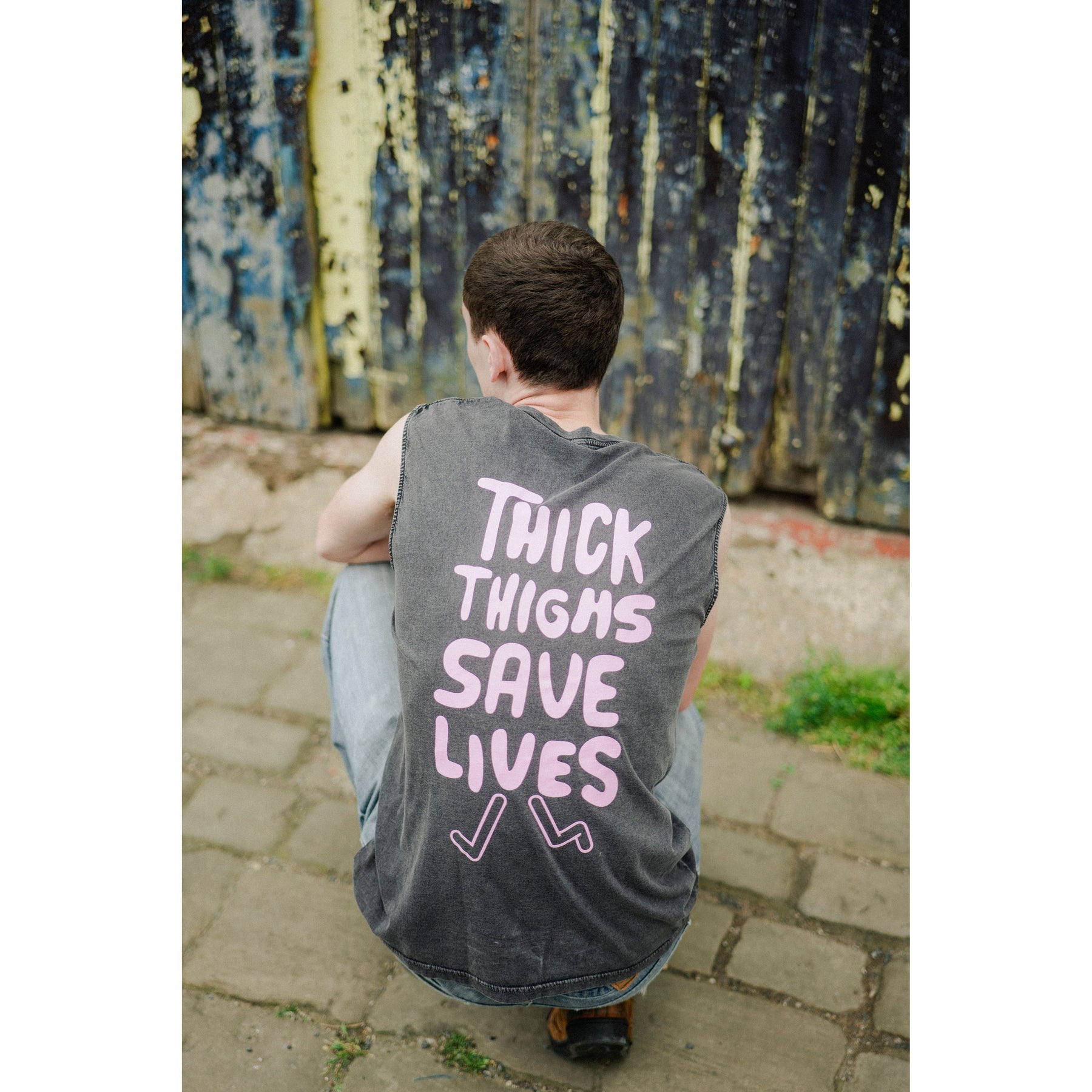 Thick Thighs Save Lives Pink logo on stone washed sleeveless tee