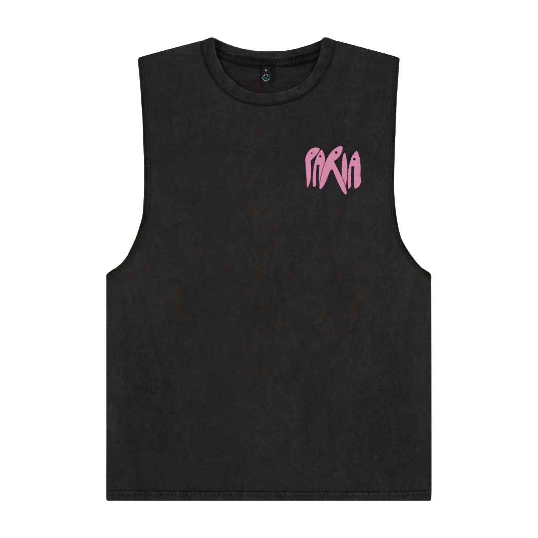 stone wash black sleeveless shirt with Paria pink logo and jeans standing in front of a textured wall.